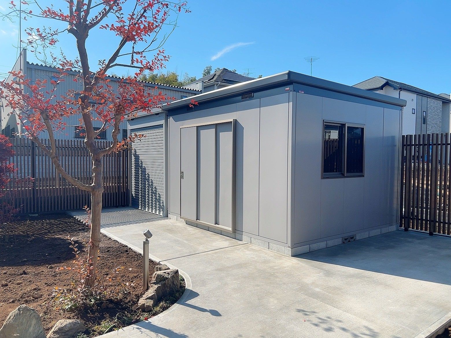 車庫2台+バイク置き場としてイナバガレージ「アルシア」を使用いたしました。
